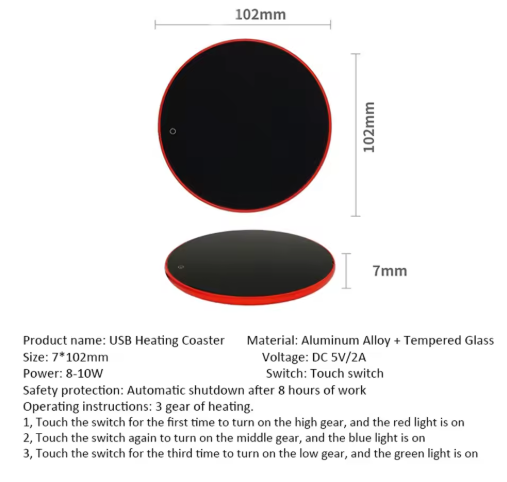 Keep your drinks perfectly warm with this portable coffee cup warmer. Designed for home, school, or office use, it offers 3 adjustable temperature settings, auto shut-off after 8 hours for safety, and a sleek aluminum alloy + tempered glass build. Lightweight and compact — ideal for cozy, efficient daily use.